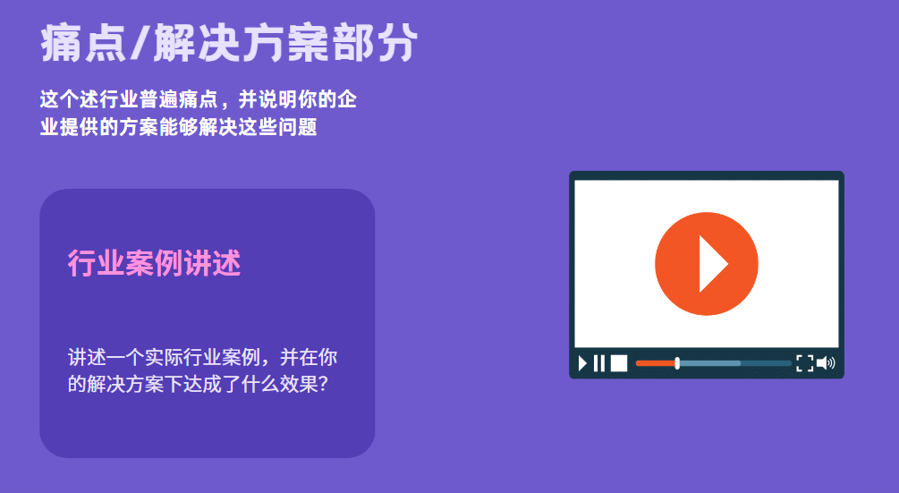 在英雄页的设计当中,你需要提及的内容:1、你是谁?(简要提及你的品牌名or公司名)2、你能提供什么价值服务?(讲述具体服务)3、如何获取?(行动号召按钮)第二:痛点/解决方案阐述: 在痛点解决方案讲述部分即 Solution Section通常你需要先阐述行业存在的普遍痛点或者未满足的需求。叙述完之后,搭载一个你自己的成功案例(帮助客户通过什么方案解决了什么问题?)需要提及的内容:1、阐述行业存在的普遍痛点或者未满足的需求2、讲述成功案例(帮助客户通过什么方案解决了什么问题?)为了增强效果,可以配上一段简短的介绍视频,展示你如何解决这些问题。研究表明,带有视频的网页转换率可以提高86%。